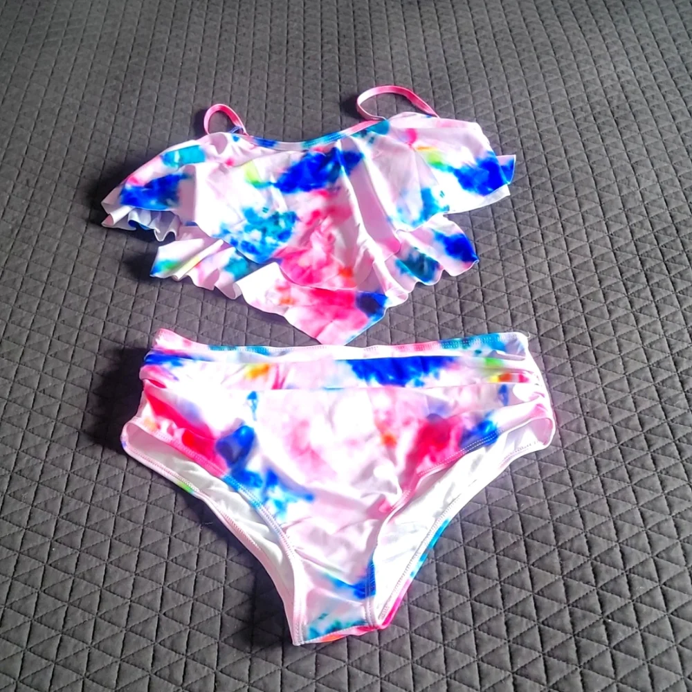 Tie-Dye tankini. Layered top with padded cups, high rise bottoms. Brand new. Approx measurements: waist 15" bust 16".