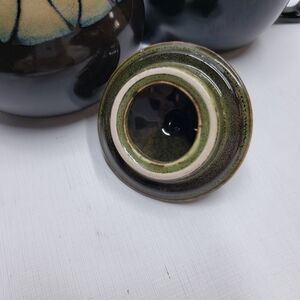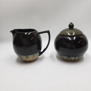 Stoneware sugar bowl with lid and creamer Brown with Green, tan details. Microwave and Dishwasher safe