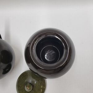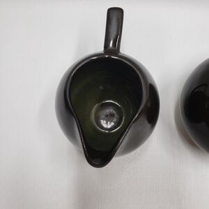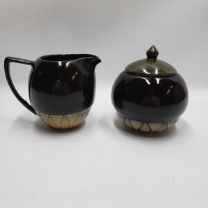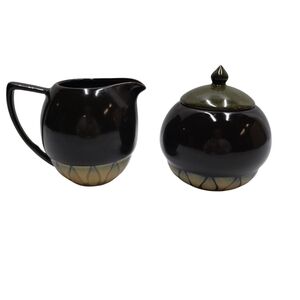 Stoneware sugar bowl with lid and creamer Brown with Green, tan details. Microwave and Dishwasher safe