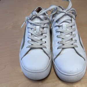 Z Soul has outside zipper for easy on/off. White Leather upper with Silver accents, removable footbed with arch and metatarsal support. Canvas lining. Orthotic friendly. Footbed treatment - antimicrobial shield. Size 8. Good condition. Small scuff mark on toe, see photos.
