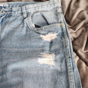 Tapered jeans. Has floral patch beneath the rips. Fit is abit loose at the waistline for a baggy look by design. Will wash with natural hypoallergenic detergent before shipping.