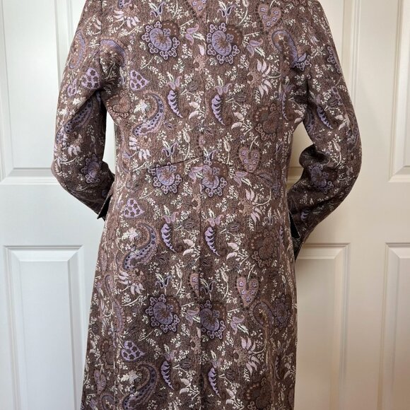Lovely early 2000’s tapestry and velvet long blazer with covered front and sleeve buttons. Has two outside flap pockets. Fully lined.