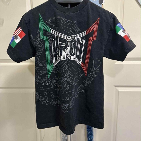 Bold Tapout logo with red and green details. Comfortable short sleeve design.