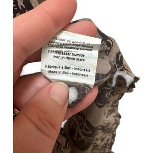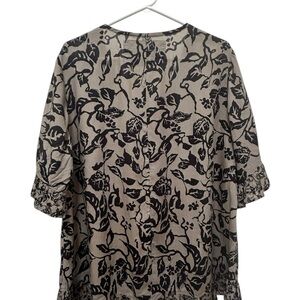 Tara Vao top a beige background and a black floral print in a size large. A flowy and oversized fit and 100% tencel. The top has a round neckline, three-quarter length sleeves with ruffled cuffs, and a ruffled hem. Tara Vao is a clothing brand that designs and produces clothing in Bali, Indonesia. It’s in excellent condition.