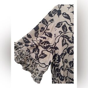 Tara Vao top a beige background and a black floral print in a size large. A flowy and oversized fit and 100% tencel. The top has a round neckline, three-quarter length sleeves with ruffled cuffs, and a ruffled hem. Tara Vao is a clothing brand that designs and produces clothing in Bali, Indonesia. It’s in excellent condition.