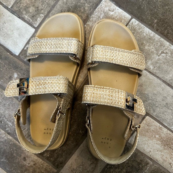 Stylish beige sandals with textured straps. Adjustable buckle closure. Comfortable footbed.