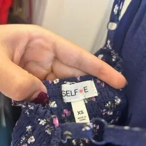 Chic navy mini dress with floral print. Features spaghetti straps. Perfect for casual outings.