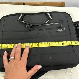 Targus small laptop bag. This bag features a fully lined interior and multiple storage pockets for organization. Includes both top handles and an adjustable shoulder strap.