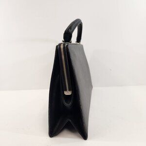 Vintage structured bag that could be a handheld tote or a type of briefcase. From the 1960s. Tiny amount of wear/tarnish on the closing buckle. Has a variety of pockets inside.