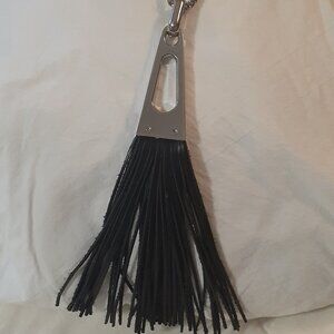 Preowned and good condition. Silver tone necklace with triangle shaped pendant with faux black leather hanging tassel. Thick chain is about 25 inches in length. The pendant and tassel hang about 7.75 inches. Well constructed piece of jewelry. An amazing alternative look whether it is punk, goth, bikercore etc..