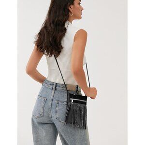 This small Tassel crossbody bag covered with shimmering glitter and has a compact interior to keep your essentials.
