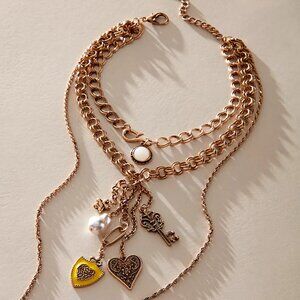 Elevate your look with a layered necklace adorned with mixed dangly charms for a vintage-inspired touch. Color is Gold.