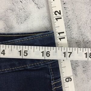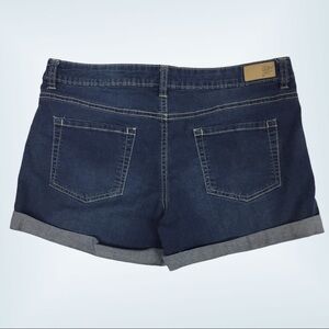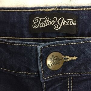 Tattoo Denim Shorts. Women's / Juniors Tag Size 11 (see measurements). Cotton, poly, rayon and spandex blend. Very soft and flexible fabric. Medium wash blue. Rolled cuffs. Attached at inna and outer seam. Finished to stop extra fray. They do sometimes need to be ironed after washing to stay properly folded. Short length. Mid rise.