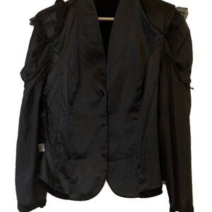 Beautiful puff sleeve retro style lined dress jacket with rhinestone buttons in luxurious velour. Puff sleeve is very well constructed with small tulle ‘pouf’ to prevent it from collapsing (refer to closeup of the shoulder construction). This jacket does not have any pockets so it will fit sleekly over evening wear. It has a simple stand up collar and no lapels so it has a very clean look with the focus on the fabric and cut.