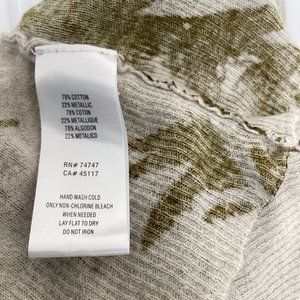 Open front cardigan of cotton/metallic yarn has olive and bronze feather print, shawl collar and long sleeves. The yarn gives the cardigan a perpetual texture for that casual look.