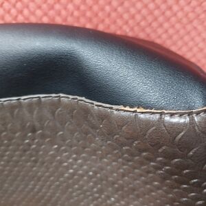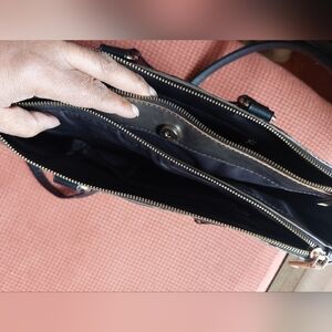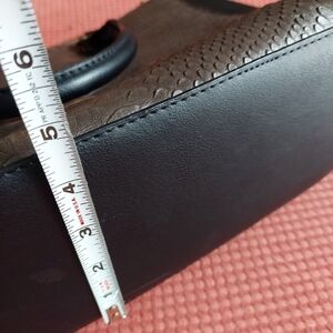 Taupe Large Formed Shell Bag. Imitation snake skin design. Black handles, sides and detachable shoulder strap. Features 2 zippered compartments and center compartment has magnet snap. EUC. Approx 13.5" x 10" x 5"