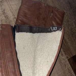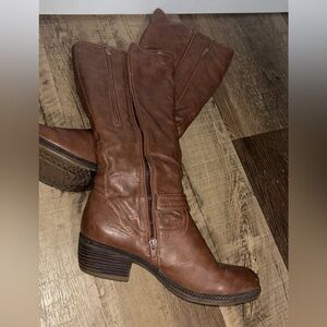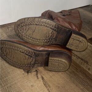 Stylish brown leather knee-high boots perfect for any occasion. Features a sleek design with buckle accents for added flair.
