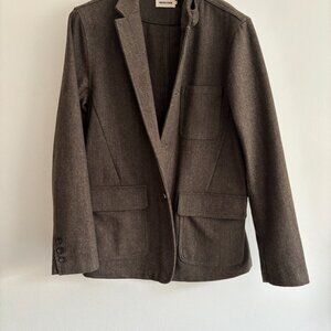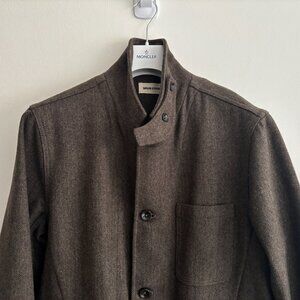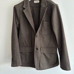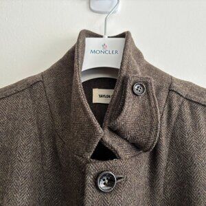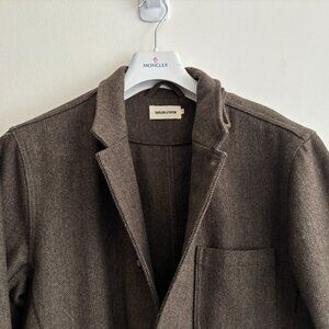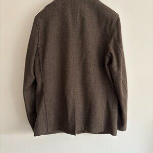 Really unique piece from Taylor Stitch. The fabric is a beautiful green brown herringbone in a wool blend. Features patch pockets with flaps at waist. There are also two zippered inner pockets. Single vented. Features a throat latch. Can be worn fully buttoned up as a coat or with the lapels folded in the manner of a blazer.