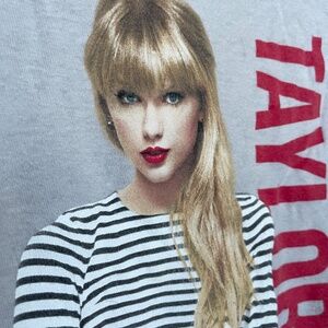 Front: photograph of Taylor Swift wearing black shorts and a striped black and white long sleeve tee, one of her iconic styles from the Red era
