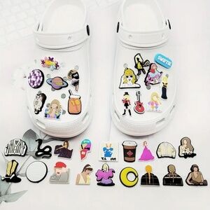 Taylor Swift 34 Pcs Crocs Shoe Charms Cartoon Shoes Charms For Clogs Sandals BRAND NEW, NEVER USED Pen for size reference *CROCS NOT INCLUDED* Step up your style game with the Taylor Swift 34 Pcs Crocs Shoe Charms collection, a whimsical and vibrant tribute to the iconic singer-songwriter. This set is a must-have for any Swiftie looking to personalize their footwear with a touch of Taylor's signature flair. Key Features: Diverse Collection: With 34 unique pieces, this set offers a wide range of Taylor Swift-themed charms, including iconic symbols from her albums and music videos, such as guitars, her beloved cats, and various album covers. Colorful and Fun: Each charm is designed with bright colors and intricate details that capture the essence of Taylor Swift's style and music. Easy to Use: The charms are made to fit easily onto any Crocs clog or sandal, allowing you to customize your footwear in seconds. High-Quality Material: Crafted from durable, waterproof materials, these charms are built to last and resist fading, ensuring they keep looking great even with regular use. Perfect for Fans: This set makes an excellent gift for any Taylor Swift fan, offering a fun way to show off their fandom and add a personal touch to their daily outfits. These Taylor Swift Crocs Shoe Charms are not just accessories; they're a celebration of music and personal style, perfect for concerts, casual outings, or just showing off your Swiftie pride wherever you go!