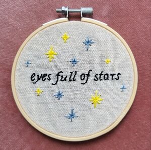 Hand stitched cowboy like me "eyes full of stars" lyrics surrounded by yellow and baby blue stars on beige linen and framed in a 4 inch bamboo hoop