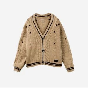 Official Taylor Swift “Fearless (Taylor’s Version)” cardigan – limited edition merch drop. Features cozy tan cable knit with embroidered black stars, black contrast trim, and a “Fearless” patch on the bottom front. Button-front closure and oversized, slouchy fit. A must-have collectible for any Swiftie and the perfect cozy layering piece.