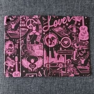 This tablet case features a striking pink and black design with whimsical urban illustrations, offering both style and protection for your device