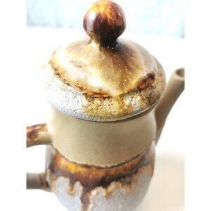 This vintage tea/coffee pot from Laurentian Pottery Limited is a round ceramic piece with a brown matte finish, perfect for adding a touch of artistry to your kitchen decor.