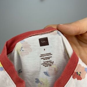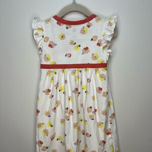 Charming floral dress with ruffle sleeves. Features a playful pattern in red, yellow, and white. Please see staining within the pleat.