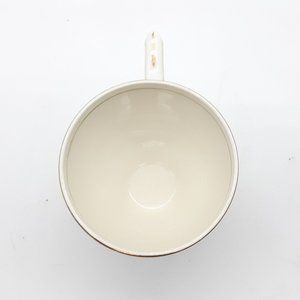 The saucer is 5 3/8" wide while the cup has a mouth of 3 1/8" while standing 2 3/4" tall.