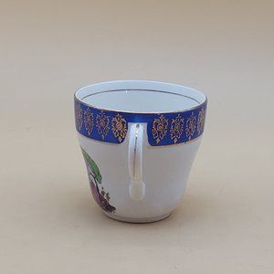 This is a "Lavender Lady" tea cup & saucer made by Barratt's as part of their Leyman Ware Duchess line. It is of the blue variety and is called Lavender Lady after the woman in the pictures. The decoration is of a woman wearing a crinoline dress sitting down for tea in her garden; in the background is a large house, a mountain and a tree. There is a band of dark blue with ornate gold filigree.