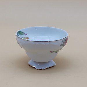 This is a tea cup and saucer made by Ucagco in Japan in the 1970s. They have green leaves with red flowers along with gold edging. There are no chips, cracks or crazing.