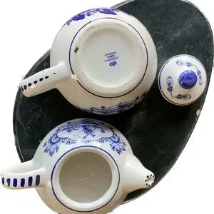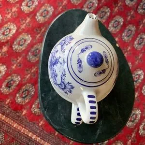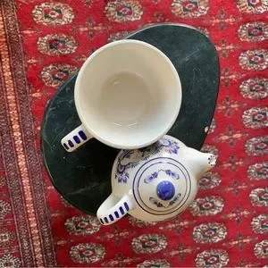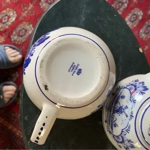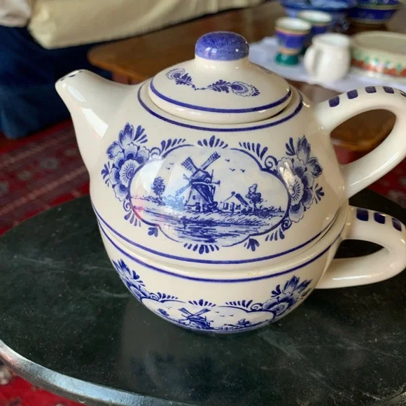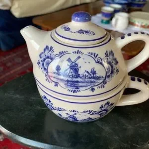 Combination cup and teapot for one by Delft Blue Holland. 4 1/2 high, cup 2 1/2 inches high. Great painting detail.
