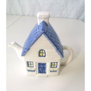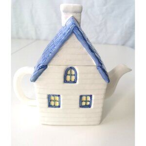 It is a small Country-style tea pot with a glossy finish, designed as a house with a removable roof that acts as a lid.