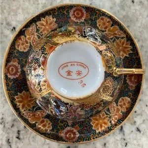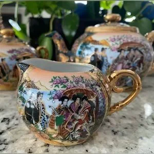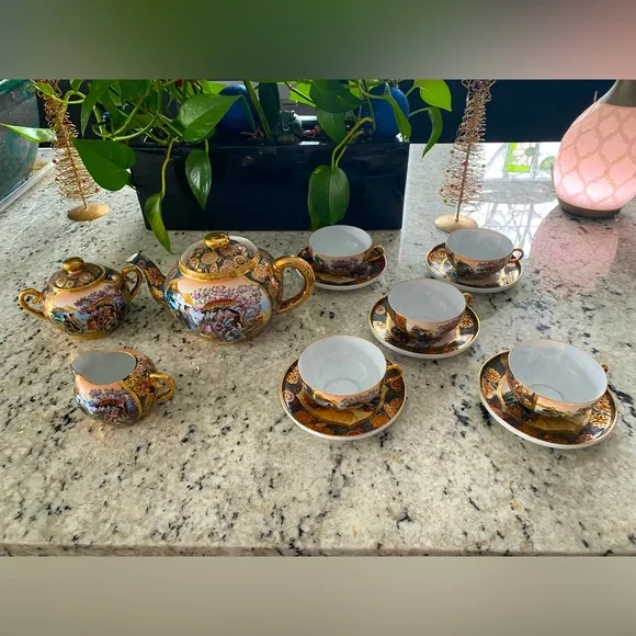 Beautifully ornate tea set from China. Very delicate and lovely tea cups (5) with heavy saucers, teapot, creamer, and sugar bowl. Sold on another platform