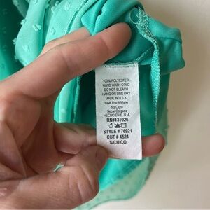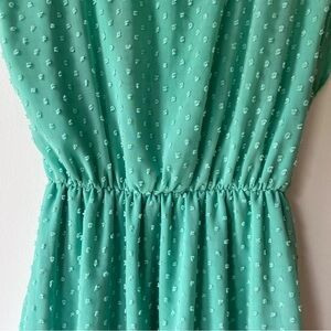 Adorable green Swiss dot dress by Tea n Rose, size Small. Features a lightweight textured chiffon overlay with an elastic waist for a flattering fit, cap sleeves, and a cute double button closure at the back. Fully lined. Made in the USA from 100% polyester — perfect for spring and summer brunches, garden parties, or everyday wear. Measurements included in photos.
