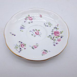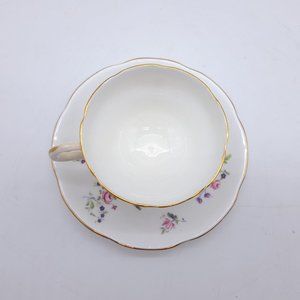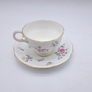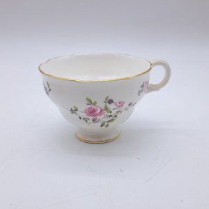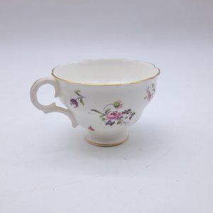 Made by Ridgway between 1952 & 64 after they took over Adderleys Ltd. They are decorated with pink flowers with green leaves and gold trim. The pattern number is M400. The saucer has an imperfection on its underside, please see the last picture. The saucer is 5 3/4" wide while the cup is 2 5/8" tall with a 3 5/8" mouth.