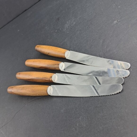 Teak Handled Cheese or Fruit Knives With Stand-Set of 4-Stainless Steel- Vintage