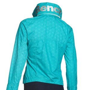 This jacket features a concealed hood on the rear of the collar and zips on the sleeve cuffs.