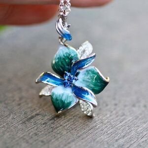 Teal Blue Green Orchid Flower Enamel Pendant Sterling Silver 925