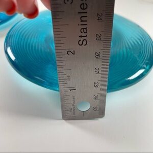Stunning Colour Teal Blue Heavy Glass Pair of Candle Holders. No chips or cracks and dies have flaws in glass, bubbles, colour consistency. See pictures provided. Circle disc shaped with ribbed design. Candles not included.