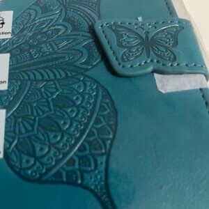 Faux leather wallet case features a beautifully embossed butterfly and floral design with a magnetic clasp shaped like a butterfly