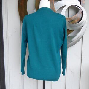 Teal Cardigan with ruffled front detail, Size Lg. 79% Rayon/30% Nylon Gently Used. Pairs with teal multi-coloured patterned v-neck stretch Jersey blouse - see in my closet.