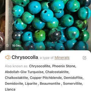 Chrysocolla is a blue green crystal with a high copper content. It is known as a healing stone among Native American cultures where it has been used to strengthen the body's resistance to illness and emotional duress. Chrysocolla is a beautiful, highly prized gemstone often used in silversmithing and goldsmithing. It is generally blue-green in color and similar to turquoise, but it's more widely available and relatively easy to work and shape. This mineral is frequently intergrown with other minerals such as Quartz, Chalcedony, and Opal, and is found in copper deposits.