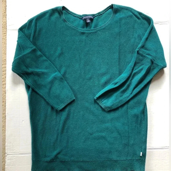 Comfy cotton sweater. Perfect for the fall! 3/4 length sleeves makes it not too hot. Very stunning vibrant teal. Sizing below is appropriate as the style is sort of a bat wing where it hangs down in the underarm area.