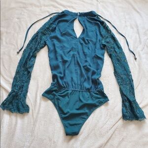 Stunning teal lace bodysuit combining a classy look with Western-style charm.