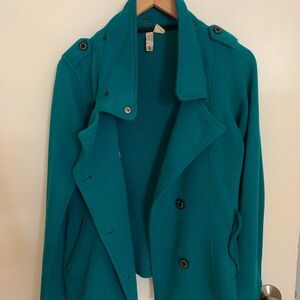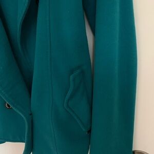 Stylish teal double-breasted jacket with button details. Perfect for a chic look.