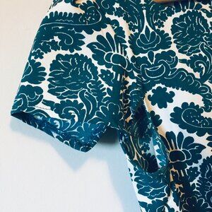 Very good preowned condition short sleeve dress by Inomi with pockets, pleats and a tie up belt. The turquoise and white pattern is so cute and reminiscent of those Hungarian folk art prints. There appears to be a faint stain at the front. I will try to wash it out and update photos soon. It looks like it can be washed out.