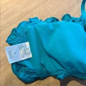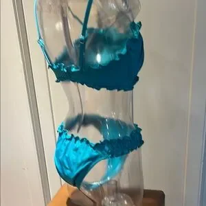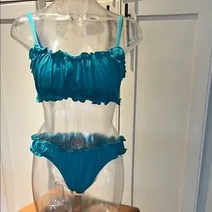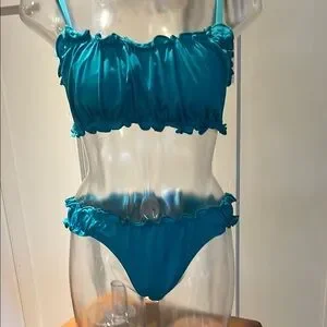 Stylish teal bikini set with ruffled edges. Perfect for beach days. small bottoms and medium top