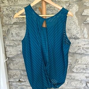 Stylish teal athletic top with horizontal stripes. Back has opening. It is semi sheer to wear over sports bra.